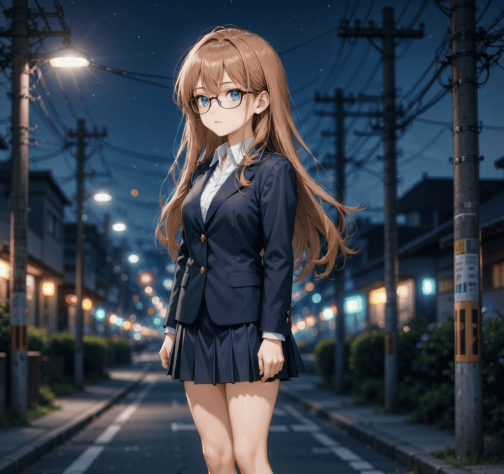 学習後、プロンプトに「<lora:あなたのキャラ名:0.8>」と書くだけで、どんなシーンでも、そのキャラが固定で出現します。