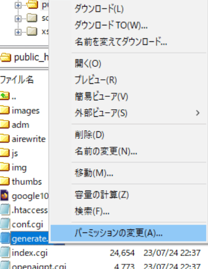 該当のファイルを選択した状態で右クリックをして、パーミッションの変更 あるいは属性の変更を選びます。