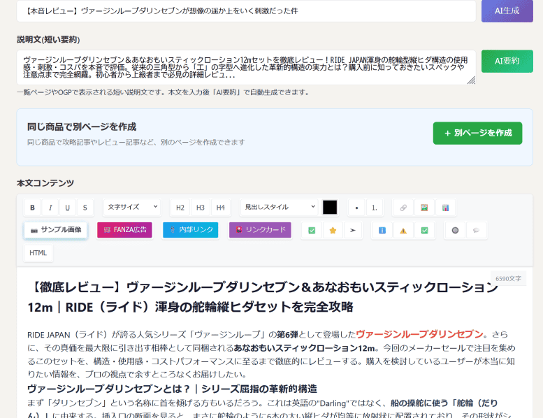 つまり、商品のレビュー記事、その他の切り口で、違う視点で需要のある商標キーワードの記事を最大6記事まで増やせる仕様です。